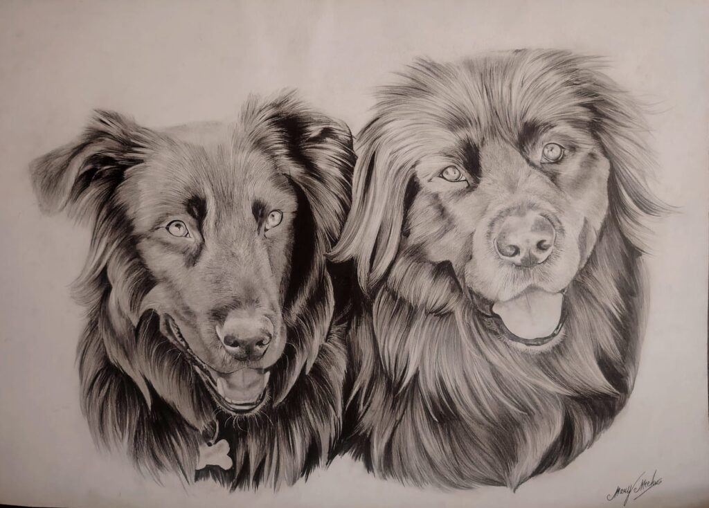 Chaque œuvre est pensée comme une pièce unique, où la précision du trait dialogue avec la sensibilité du geste. Le graphite, par sa profondeur et sa sobriété, révèle l’essence du sujet : un regard, une attitude, une présence. Humain ou animal, le portrait cherche toujours à capter ce qui ne se voit pas immédiatement.